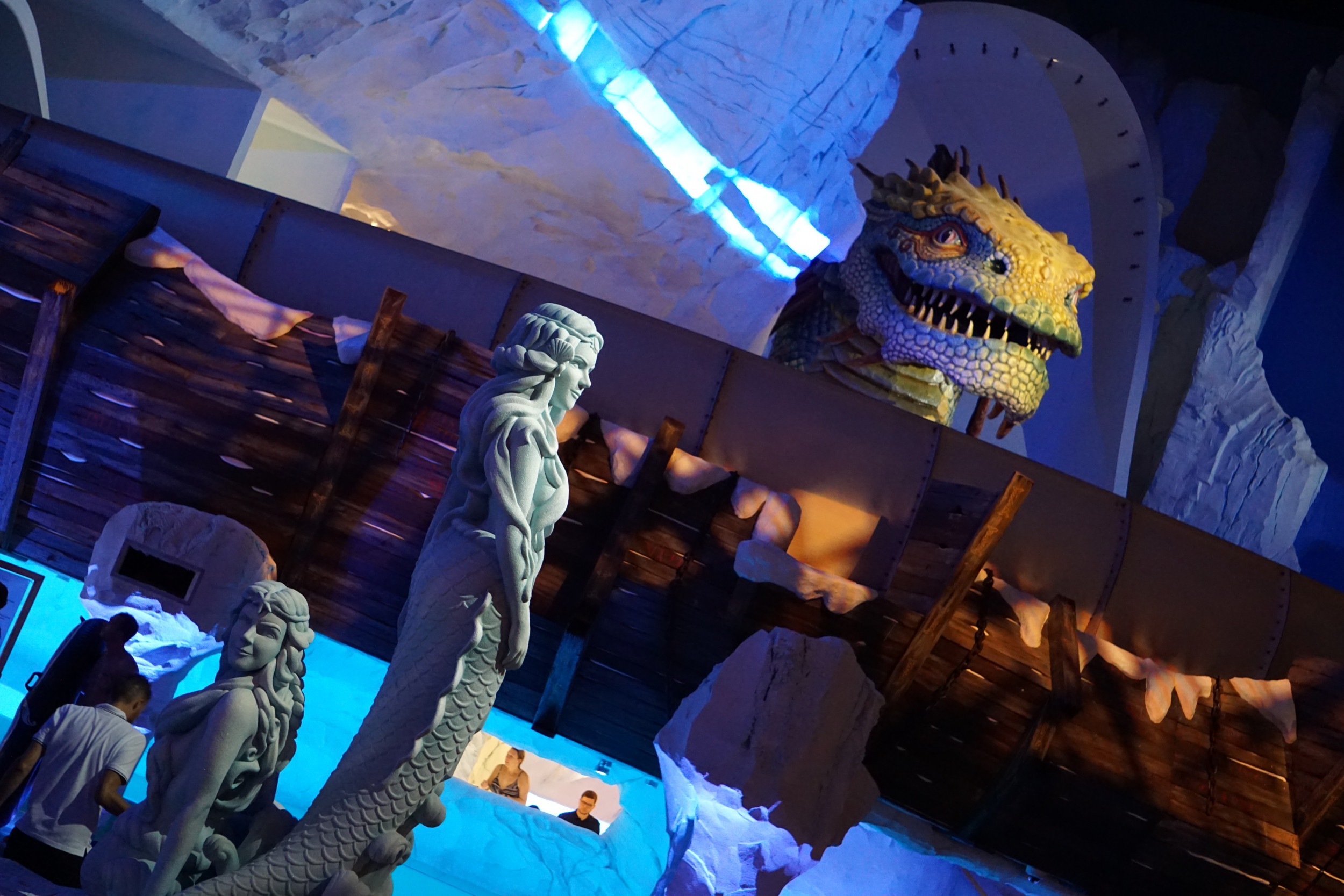 "Im Jahre 2017 entdeckten skandinavische Fischer Teile der einst versunkenen Tre Kronor. Es heißt, das Expeditionsschiff war unterwegs, um das Geheimnis der sagenumwobenen Insel Rulantica zu lüften. Die inzwischen an der Fundstelle zahlreich geborgenen Relikte und Artefakte können Sie nun erstmalig im neuen Hotel "Krønasår" und in der angrenzenden Fischmarkthalle bewundern." Textauszug aus dem Rulantica Kompass Lageplan.