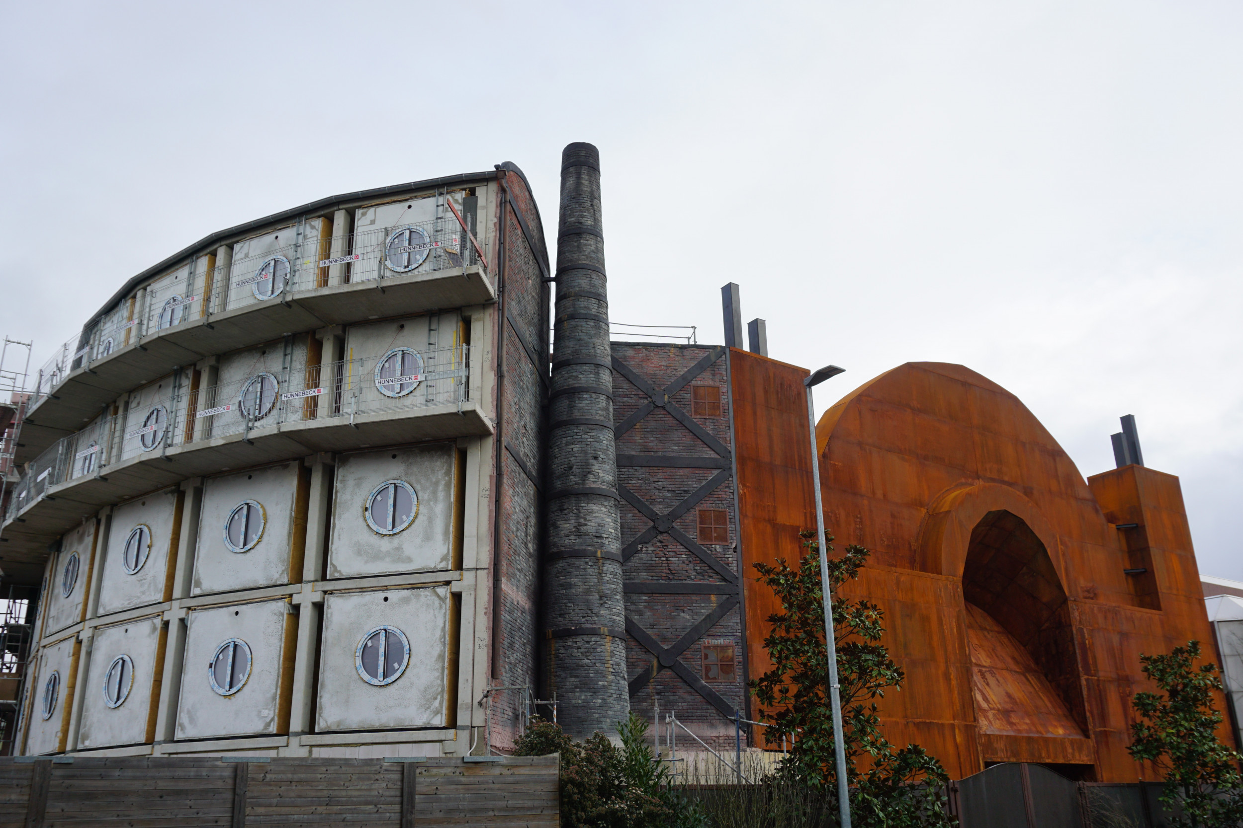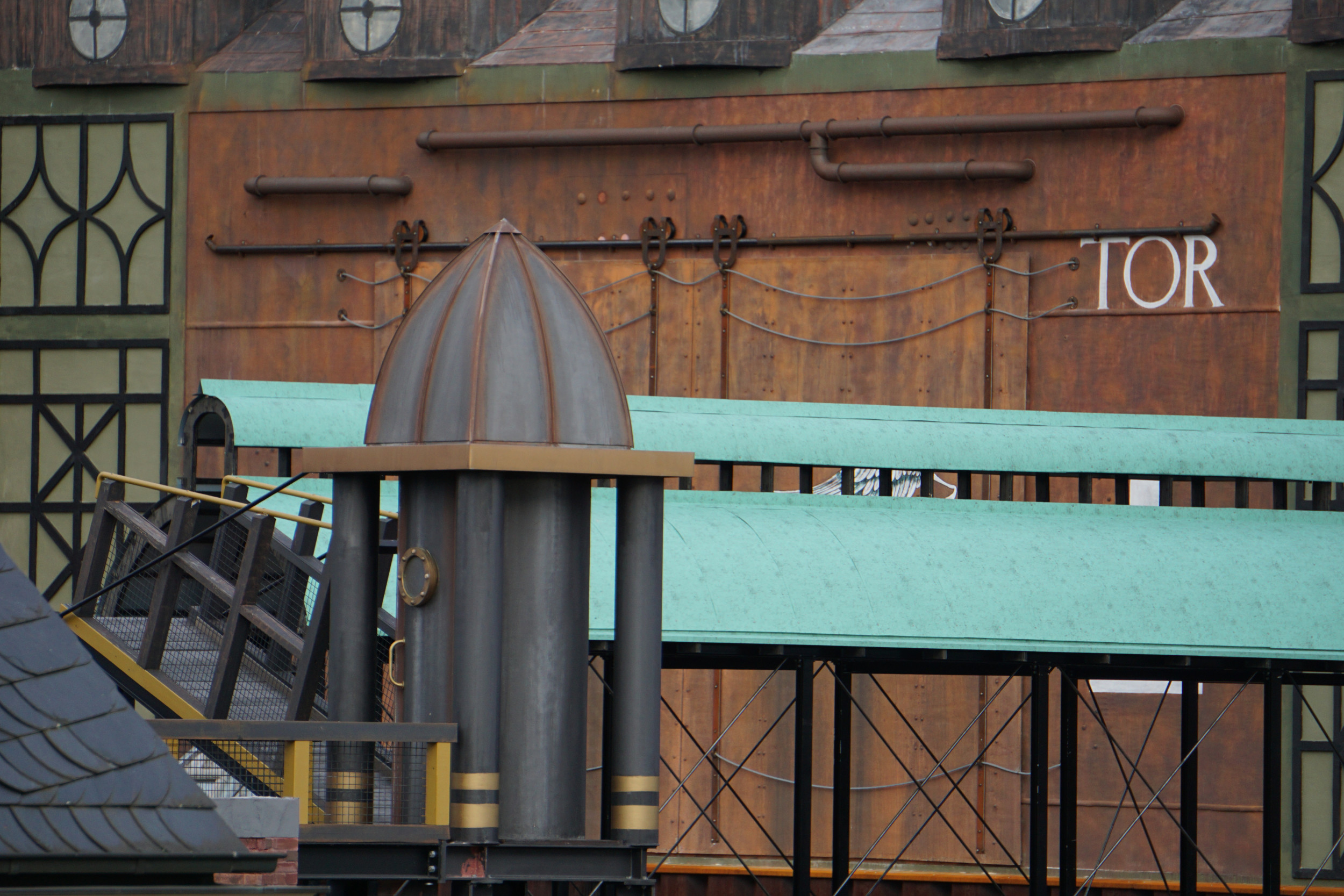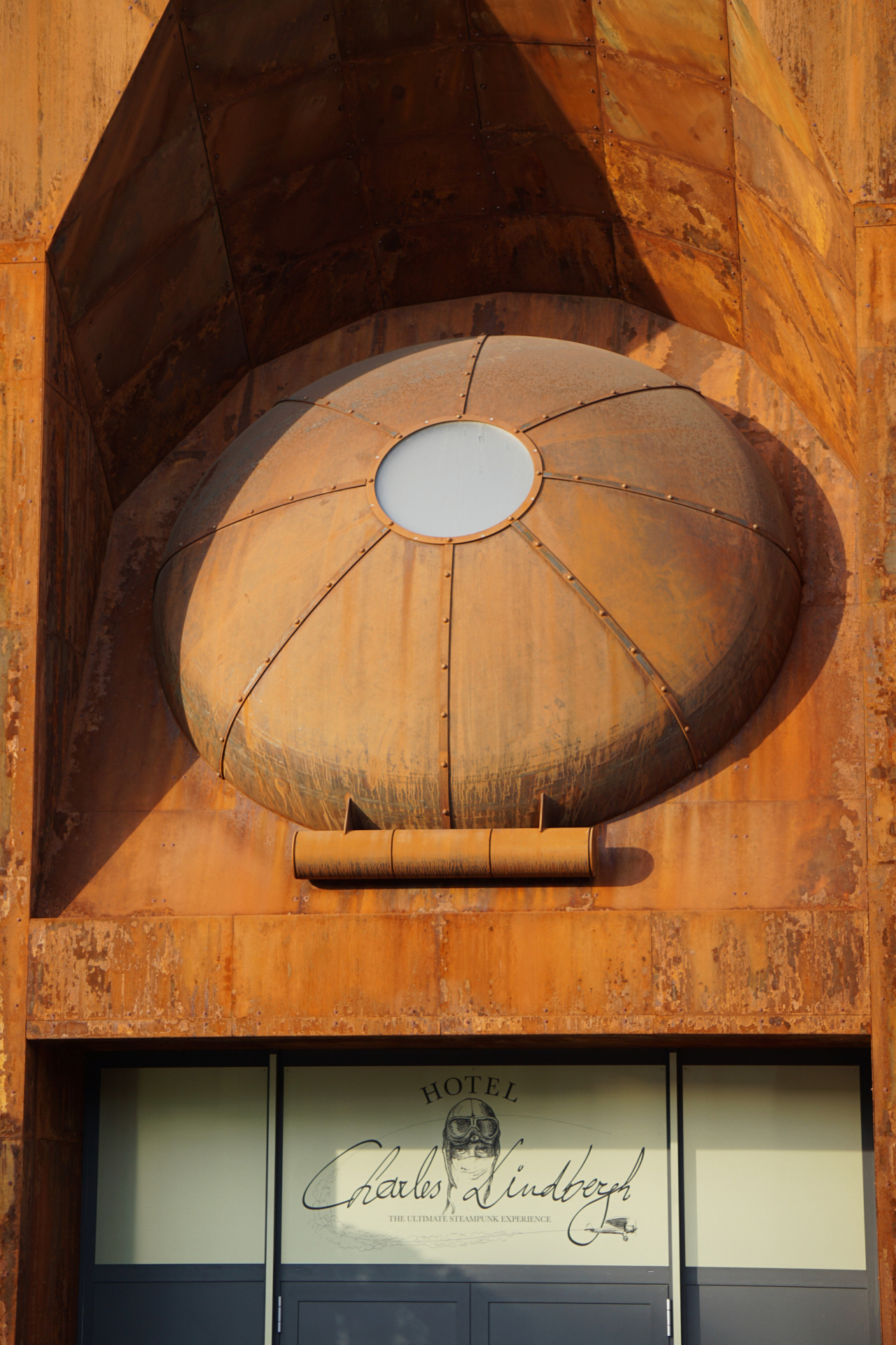 Schon jetzt sind es die zahlreichen Details, welche einen ersten Vorgeschmack auf das pulsierende Innenleben der neuen faszinierenden Steampunkwelt ermöglichen: So thront über der imposanten Eingangspforte ein edel geschwungener Schriftzug. Wie Bullaugen eines Schiffes, ragen an einer anderen Stelle kleine rundförmige Fenster aus dem Mauerwerk, welche den einzigartigen Capsule-Rooms zuzuordnen sind. Und am Fuße des Hotels, sprießt bereits eine immergrüne Botanik aus dem Boden, die einen farblichen und lebendigen Kontrast zu den rauen Fassadenabschnitten bildet.