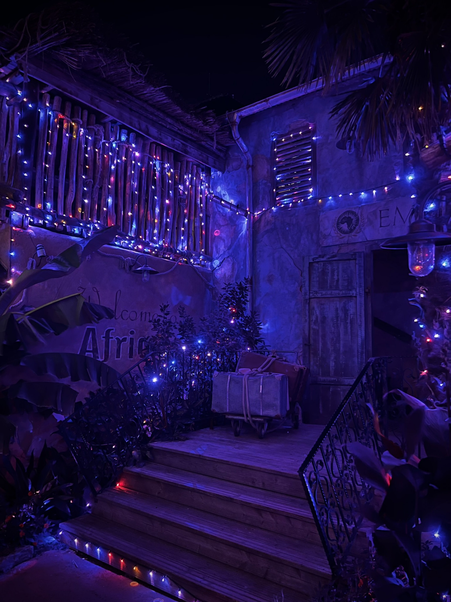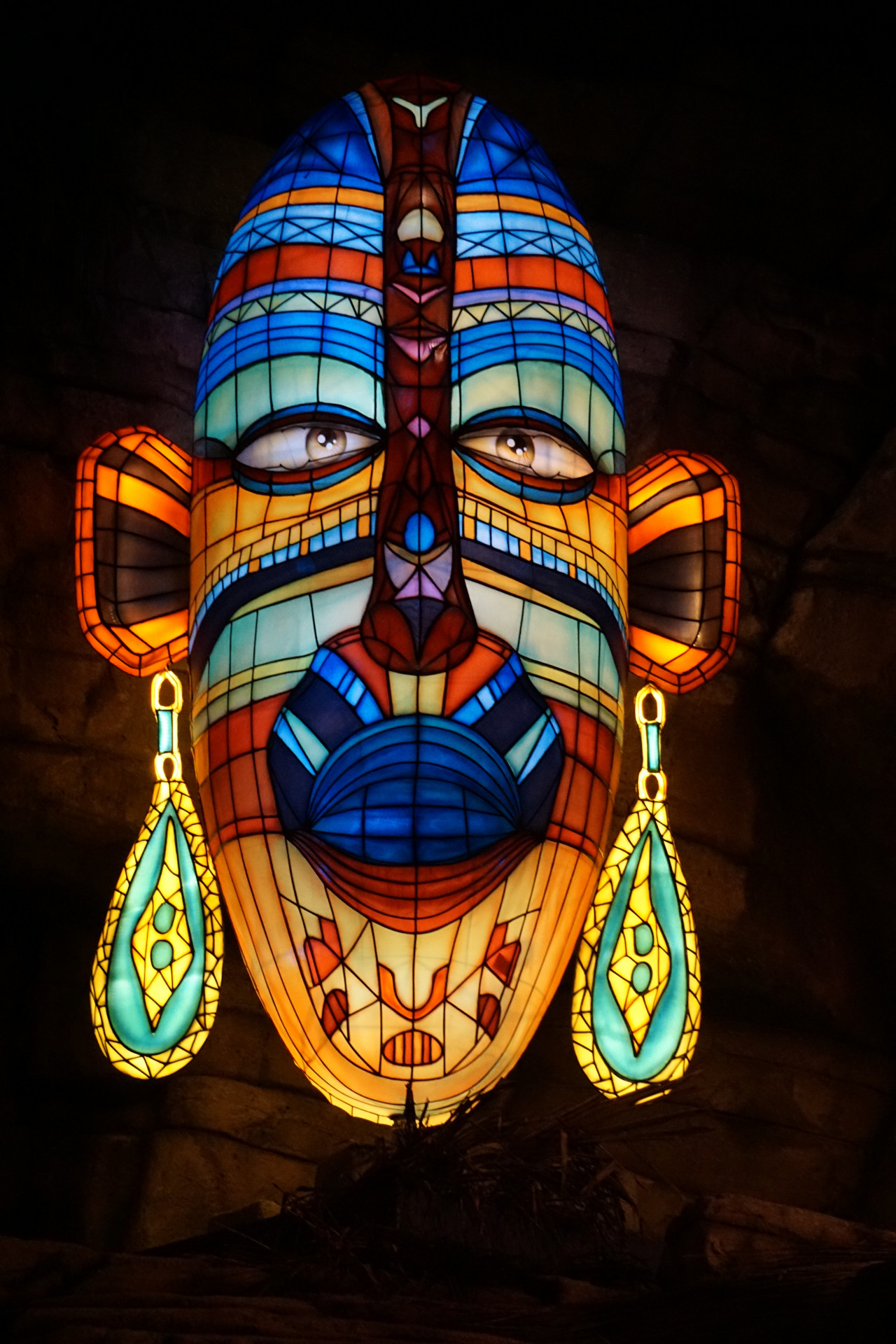Inmitten der eng verschlungenen Topographie des mehrfach ausgezeichneten Inverted-Coasters Black Mamba tragen abends leuchtende Maskeninstallationen zu den zahlreichen dekorativen Elementen bei, die Besucher in eine immersive Dschungel- und Dorflandschaft entführen.
