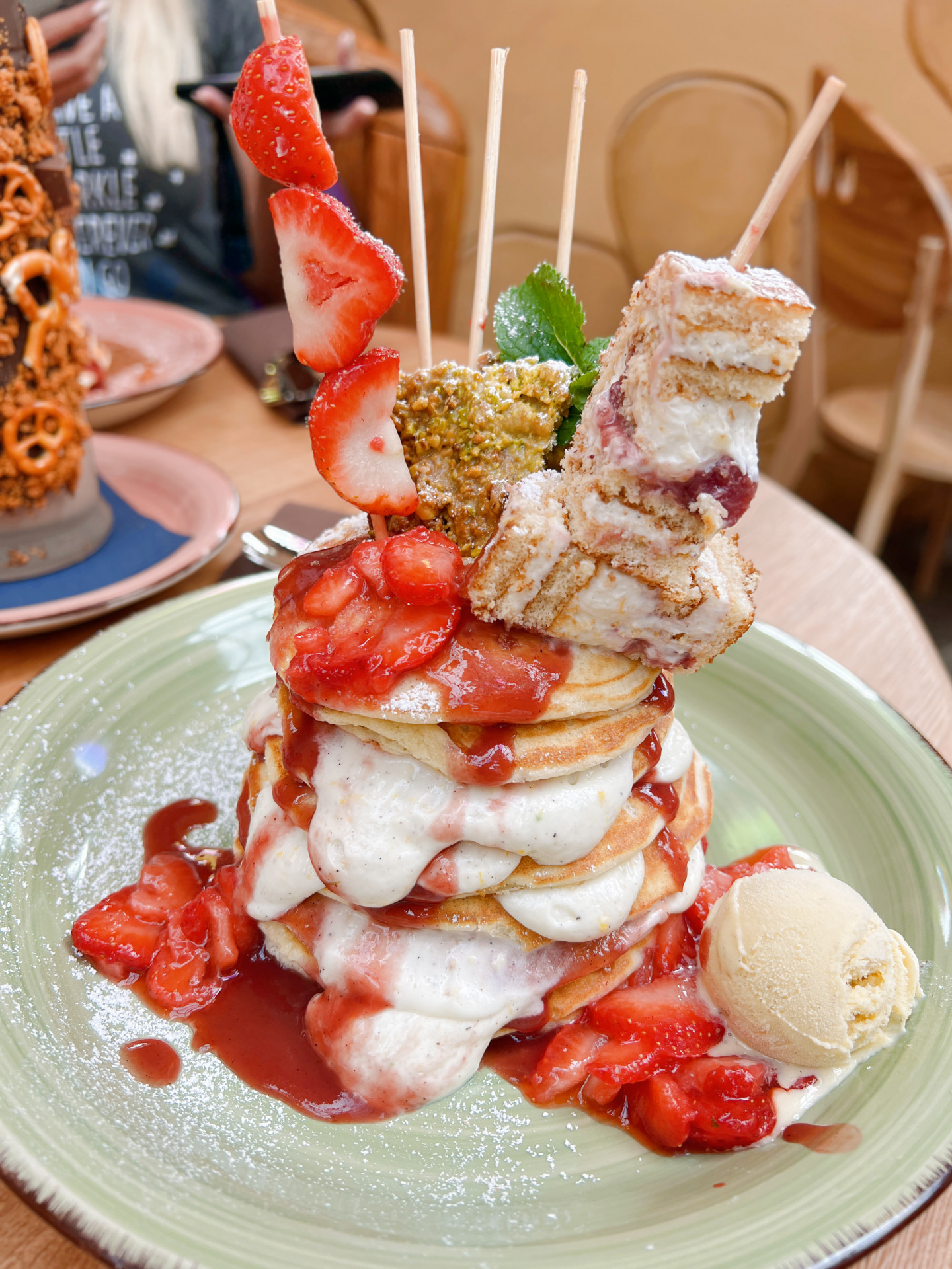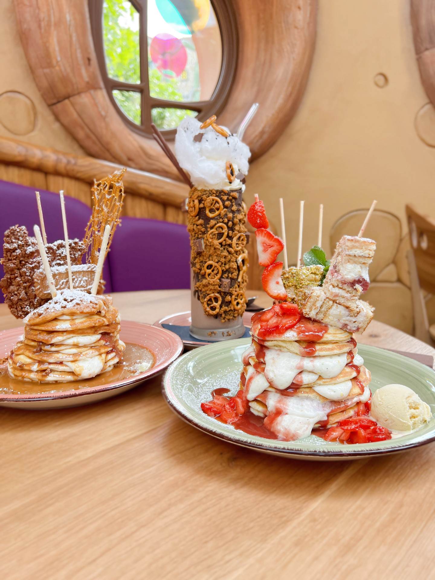 Im neuesten Genussort des Phantasialand entstehen keine gewöhnlichen Pfannkuchen, sondern sorgfältig inszenierte Kreationen. Goldbraun gebacken, luftig und mit einer Detailverliebtheit angerichtet, die sie fast zu kleinen Kunstwerken macht. Die Kombination aus verspielter Süßwarenoptik und klarer Präsentation sorgt dafür, dass hier nicht einfach serviert wird – hier wird inszeniert.