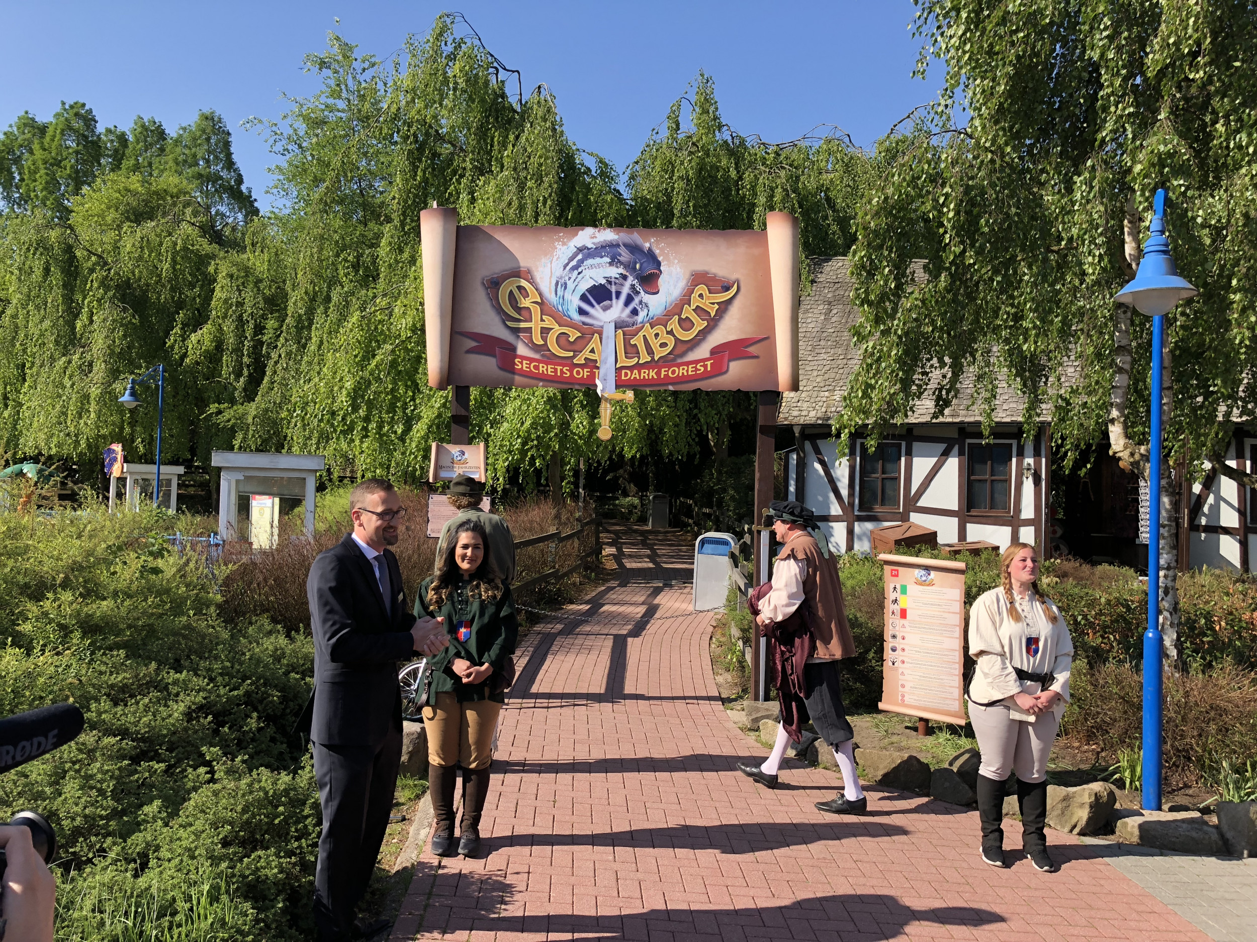Während Geschäftsführer Thorsten Backhaus am Eingang der neuen Attraktion „Excalibur – Secrets of the Dark Forest“ stolz deren Eröffnung bekannt gibt, schleichen sich am anderen Ende die letzten Mitarbeiter mit Staubsauger und Pinsel aus dem Fahrgeschäft. „Wir haben richtig Gas gegeben, um Excalibur noch vor den Maifeiertagen unseren Gästen präsentieren zu können“, sagt er mit einem zufriedenen Lächeln. „Die vielen frostigen Tage haben es uns wirklich nicht leicht gemacht, aber jetzt ist es endlich so weit.“ Ab heute wartet im Movie Park Germany das neue Abenteuer rund um Merlin, König Artus und Excalibur auf die Besucher.