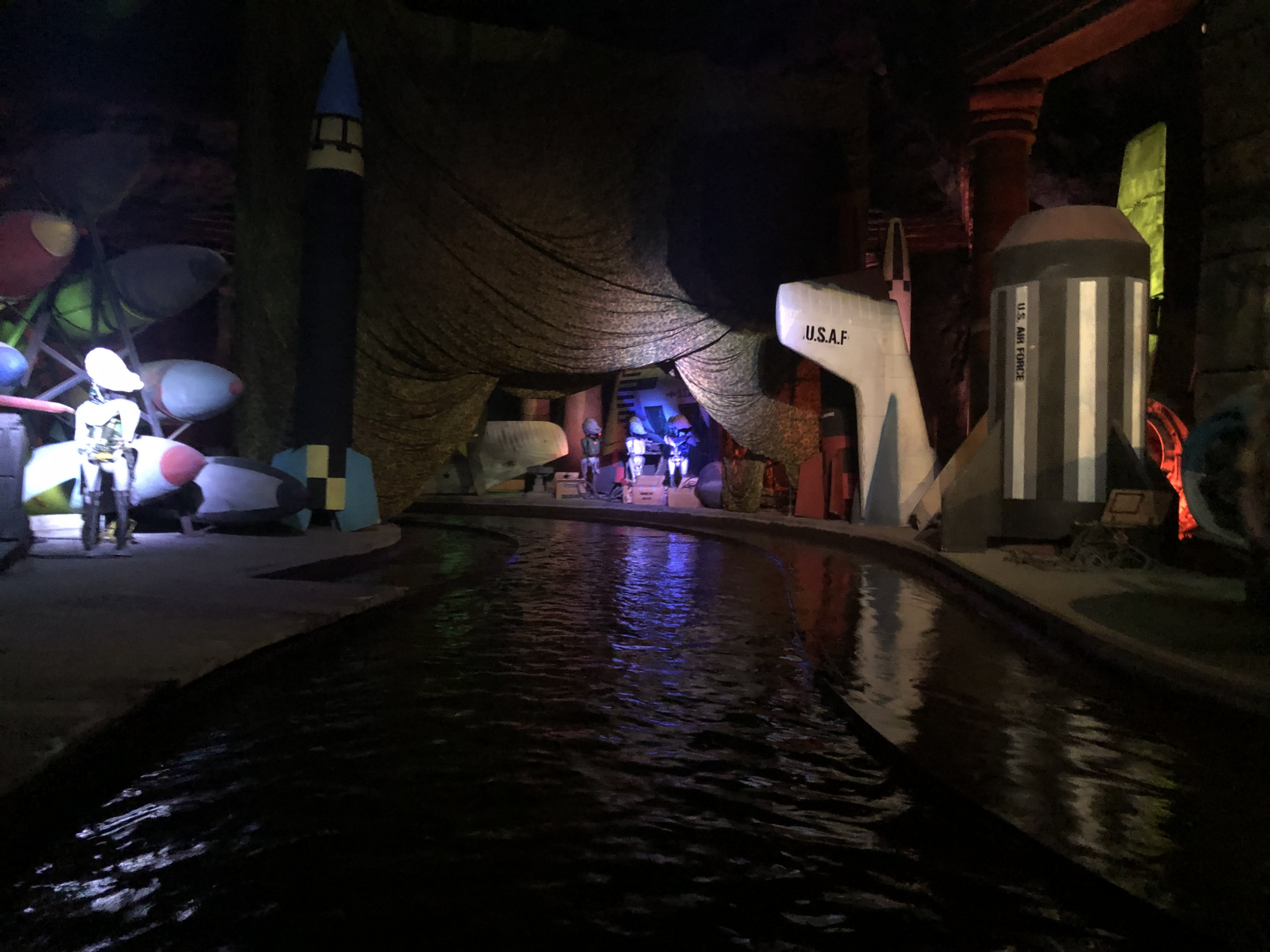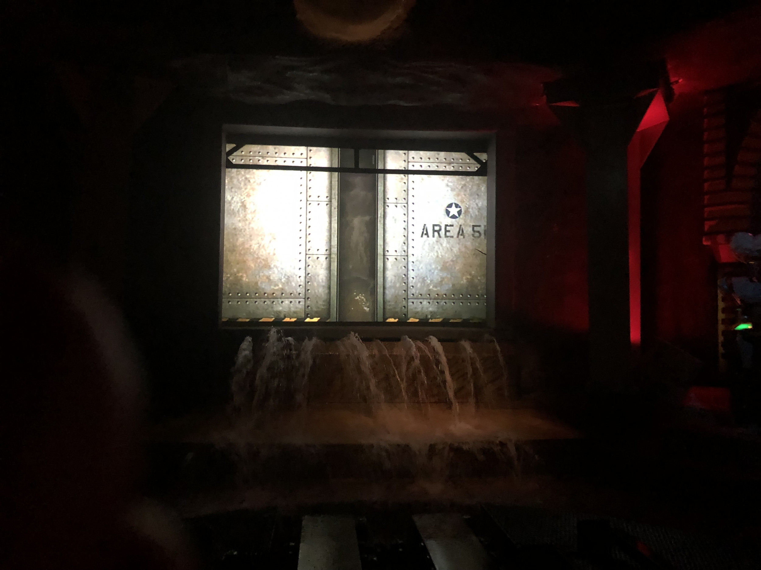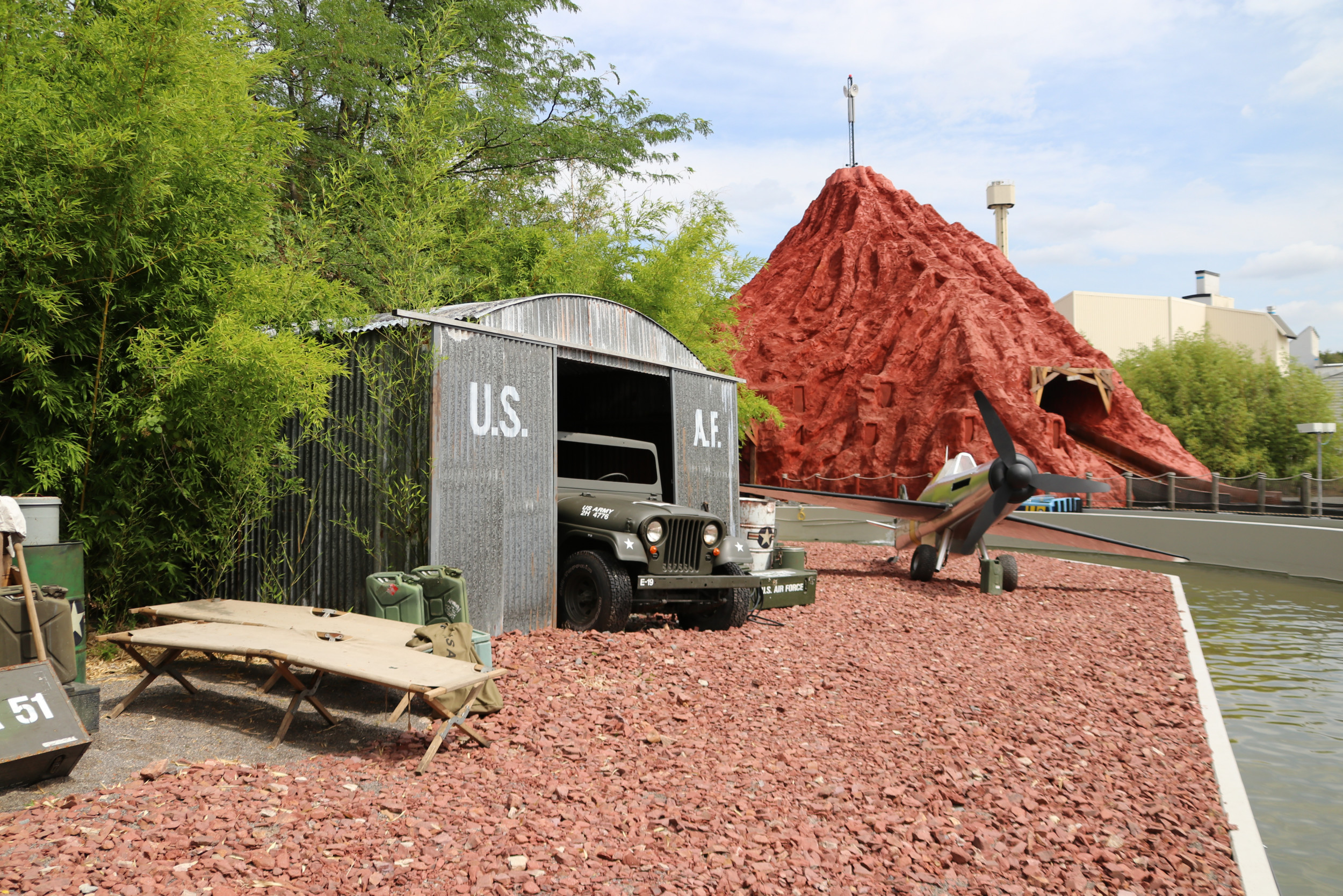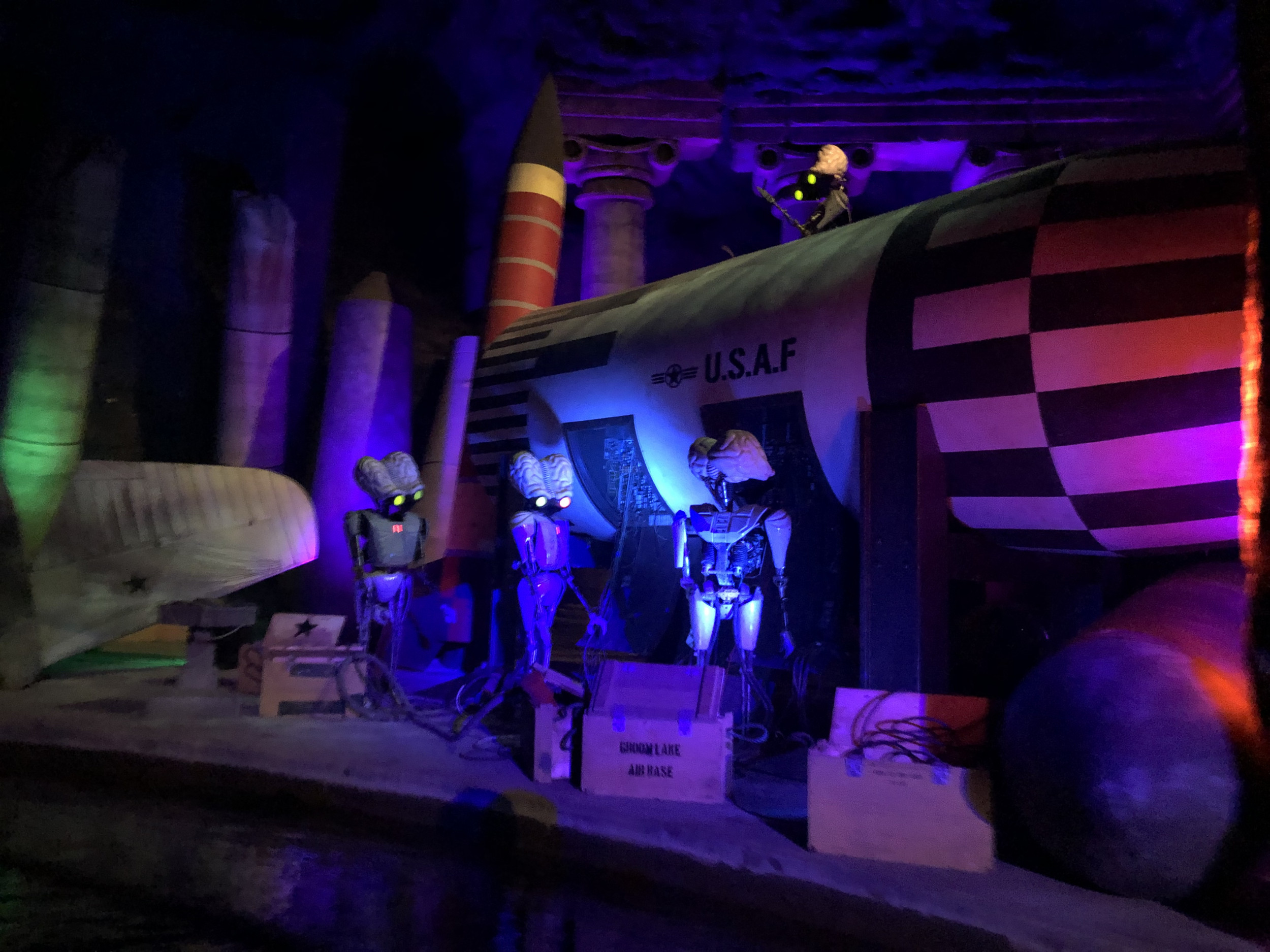 Damit die Attraktion so authentisch wie möglich gestaltet ist, kamen zahlreiche Requisiten und sogar echte Militärgegenstände der US Air Force zum Einsatz: Angefangen bei den 100 Prozent originalgetreuen Repliken der Area 51-Warnschilder, einem Militärflugzeug im Maßstab 1:3, US-typischen Strommästen, einem Aufsichtsturm oder den typischen Willy US-Militär-Jeeps, komplettieren auch originale Militär-Feldbetten aus dem Jahr 1950 oder originale Bestandteile eines US-Düsenjets sowie echte Flugzeugteile die Attraktion. Highlight ist auch ein 300 m² großer originaler US Army Fallschirm, mit dem sonst schwere Lasten und Jeeps zu Boden segeln. Der Turntable und die Boote, in die sich die Besucher für ihre Entdeckungsreise begeben, wurden nicht nur farblich neugestaltet, sondern auch technisch komplett überholt und an die Thematik rund um die US Air Force Base angepasst. Auch hier orientierte sich das Projektteam beim Design und den Farbschemata streng an den Original-Farben der zeitlichen Epoche. Da sich der Luftwaffen-Stützpunkt in der Wüste Nevadas befindet, wurde auch der ehemalige Vulkan an die Storyline angeglichen und erstrahlt nun in neuem, roten Glanz – passend zu den Steinen und Felsen in der amerikanischen Wüste – und wurde mit den für die Region typischen Mieneneingängen versehen.