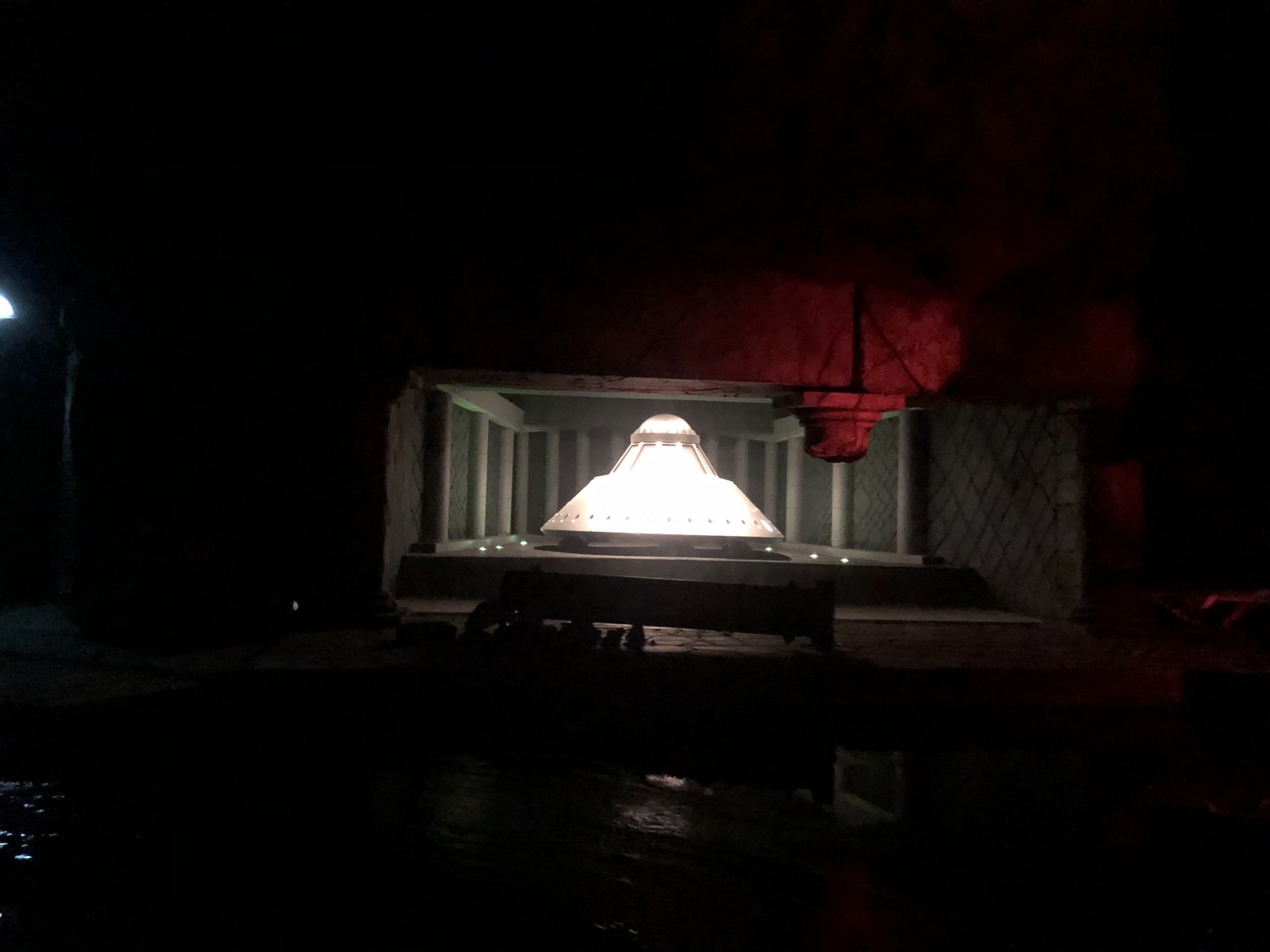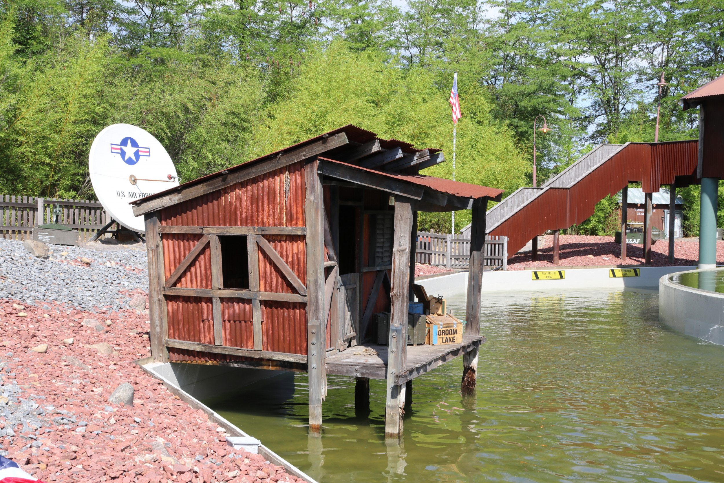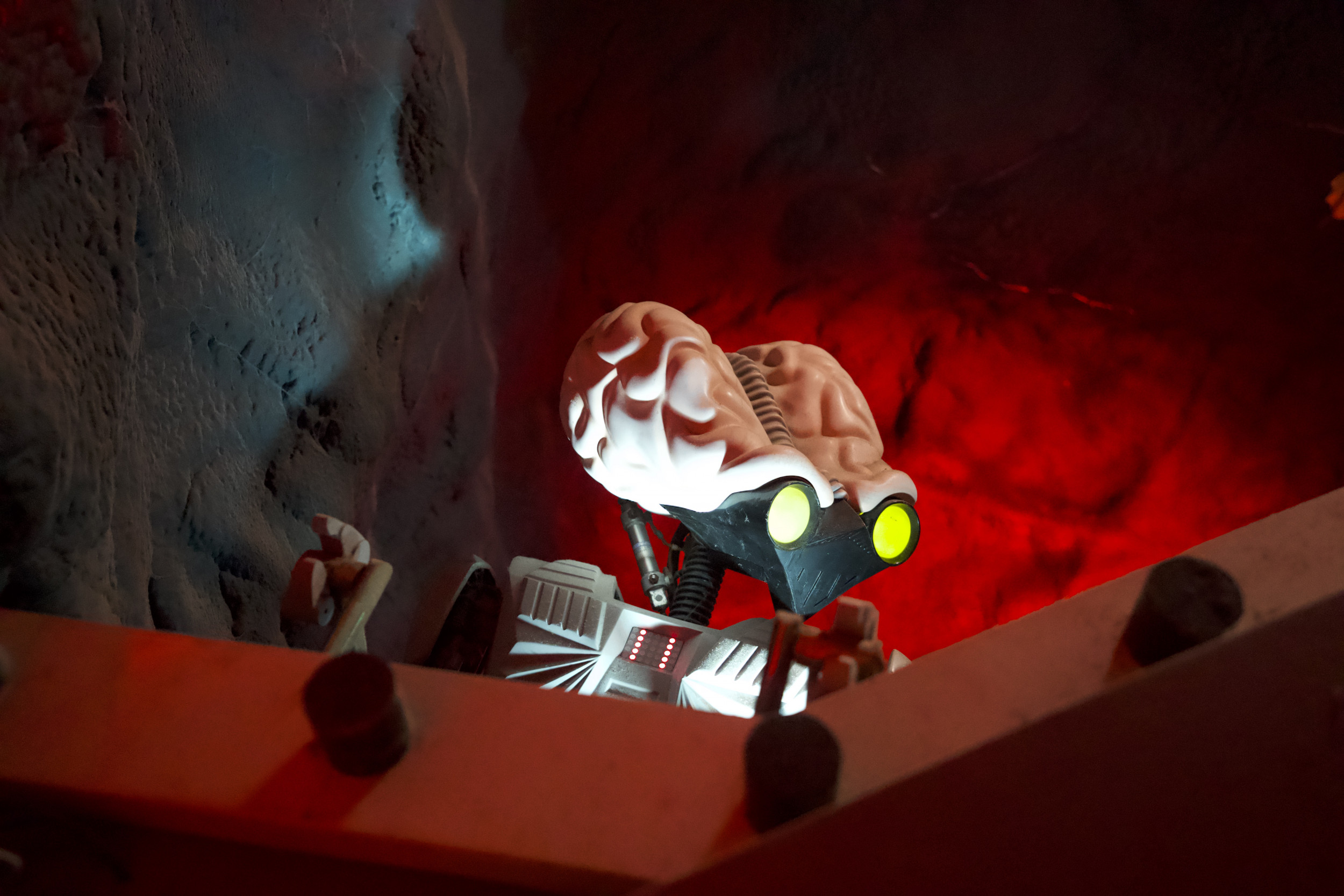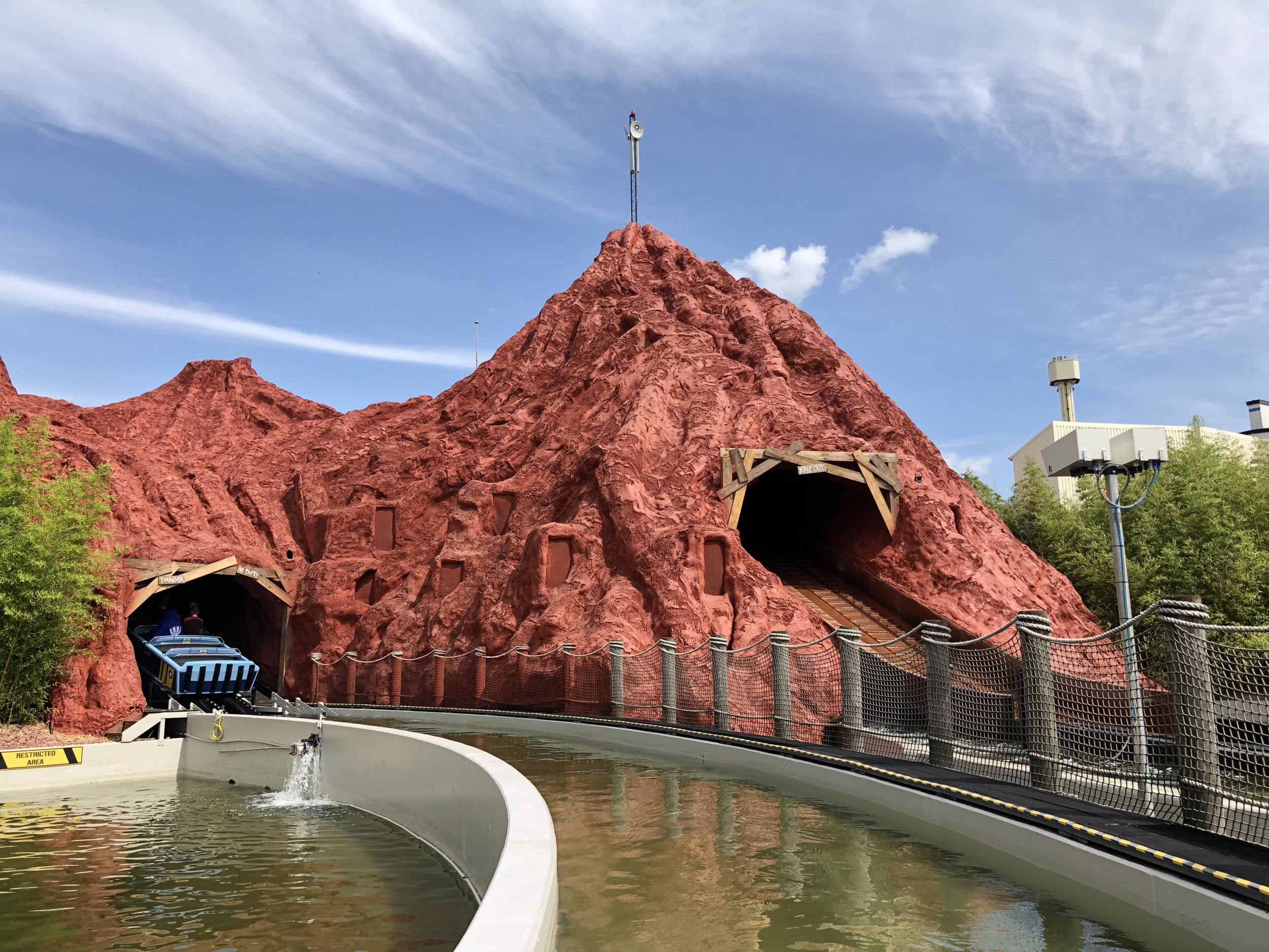 Damit die Attraktion so authentisch wie möglich gestaltet ist, kamen zahlreiche Requisiten und sogar echte Militärgegenstände der US Air Force zum Einsatz: Angefangen bei den 100 Prozent originalgetreuen Repliken der Area 51-Warnschilder, einem Militärflugzeug im Maßstab 1:3, US-typischen Strommästen, einem Aufsichtsturm oder den typischen Willy US-Militär-Jeeps, komplettieren auch originale Militär-Feldbetten aus dem Jahr 1950 oder originale Bestandteile eines US-Düsenjets sowie echte Flugzeugteile die Attraktion. Highlight ist auch ein 300 m² großer originaler US Army Fallschirm, mit dem sonst schwere Lasten und Jeeps zu Boden segeln. Der Turntable und die Boote, in die sich die Besucher für ihre Entdeckungsreise begeben, wurden nicht nur farblich neugestaltet, sondern auch technisch komplett überholt und an die Thematik rund um die US Air Force Base angepasst. Auch hier orientierte sich das Projektteam beim Design und den Farbschemata streng an den Original-Farben der zeitlichen Epoche. Da sich der Luftwaffen-Stützpunkt in der Wüste Nevadas befindet, wurde auch der ehemalige Vulkan an die Storyline angeglichen und erstrahlt nun in neuem, roten Glanz – passend zu den Steinen und Felsen in der amerikanischen Wüste – und wurde mit den für die Region typischen Mieneneingängen versehen.