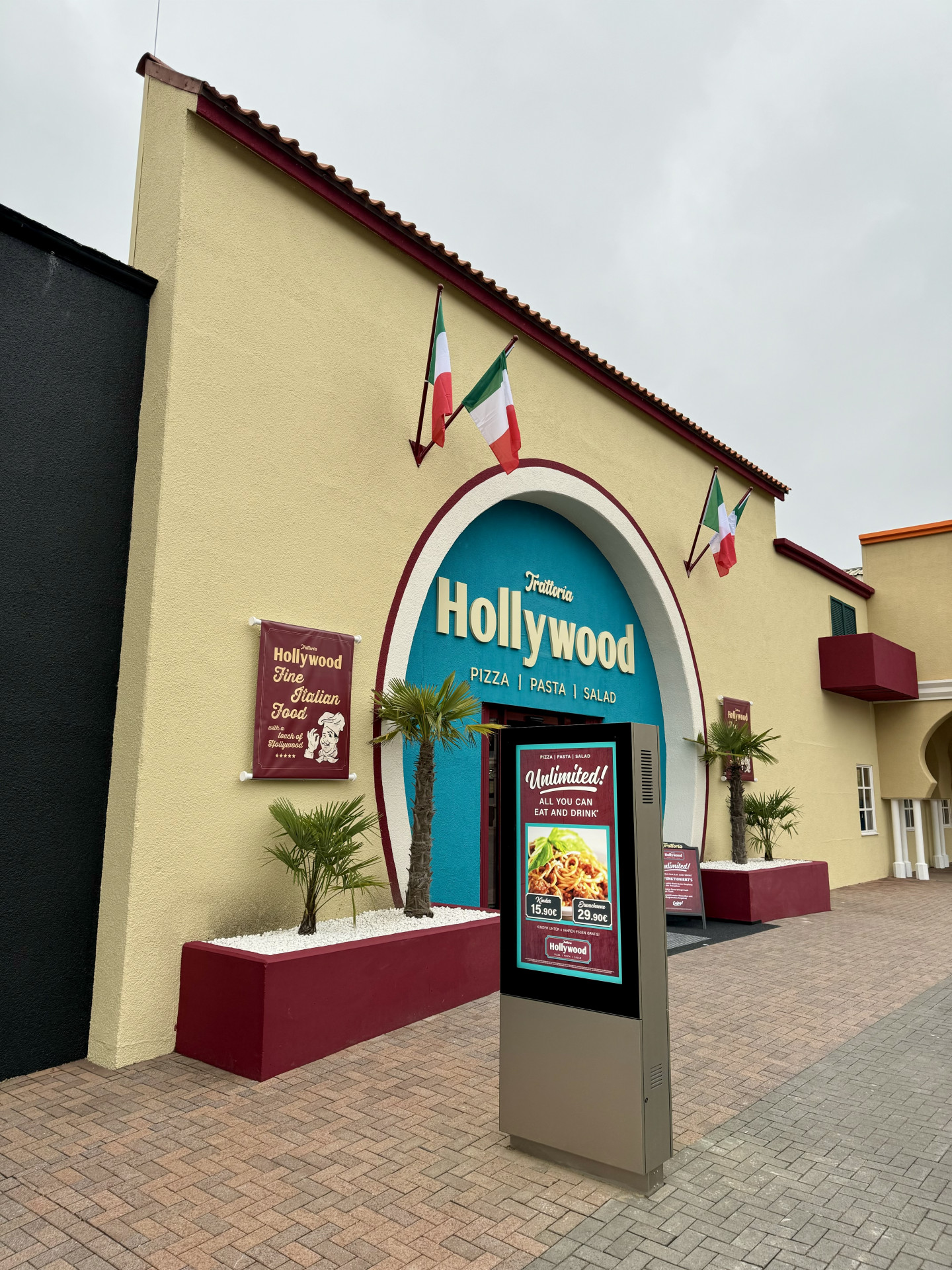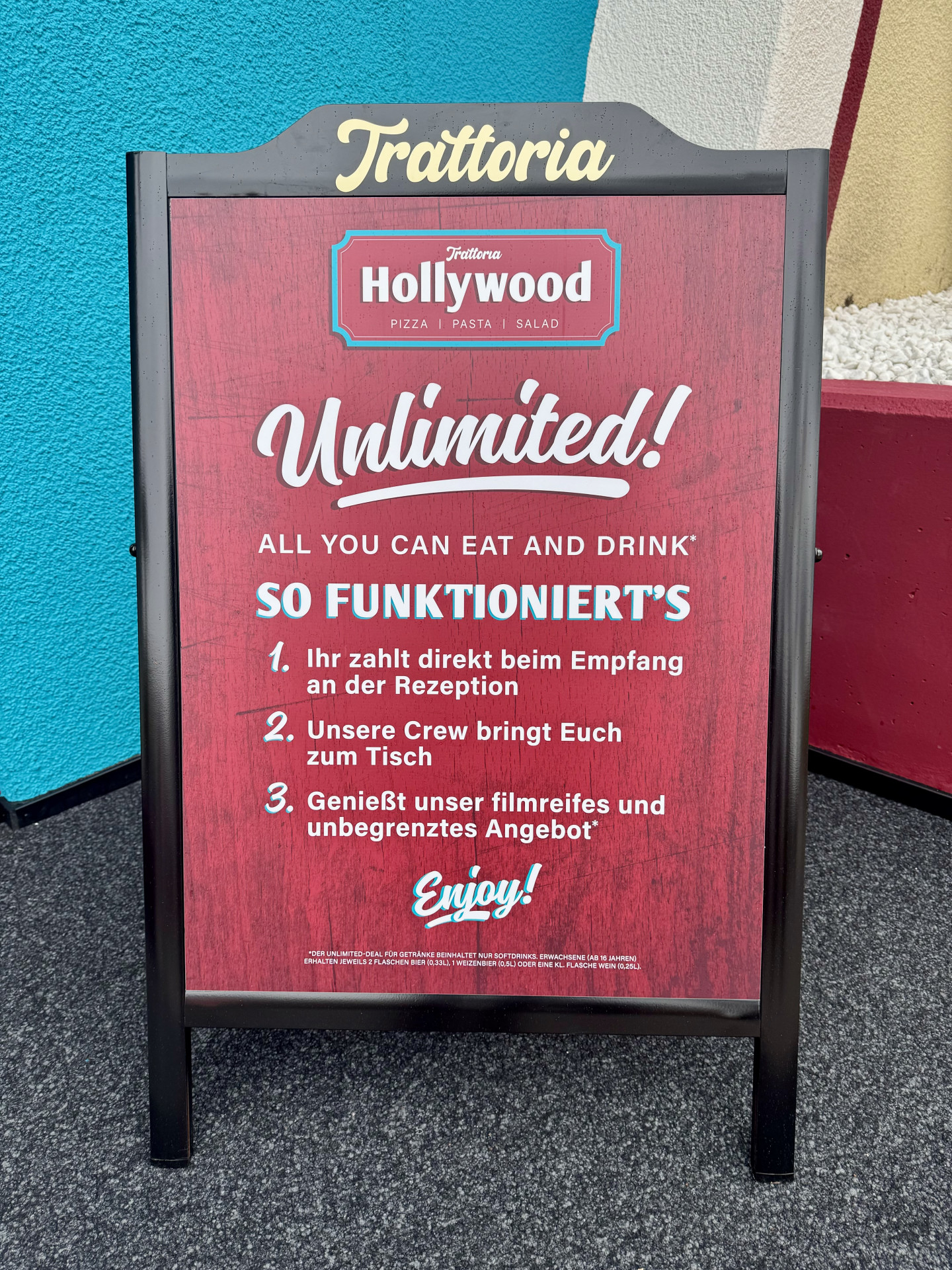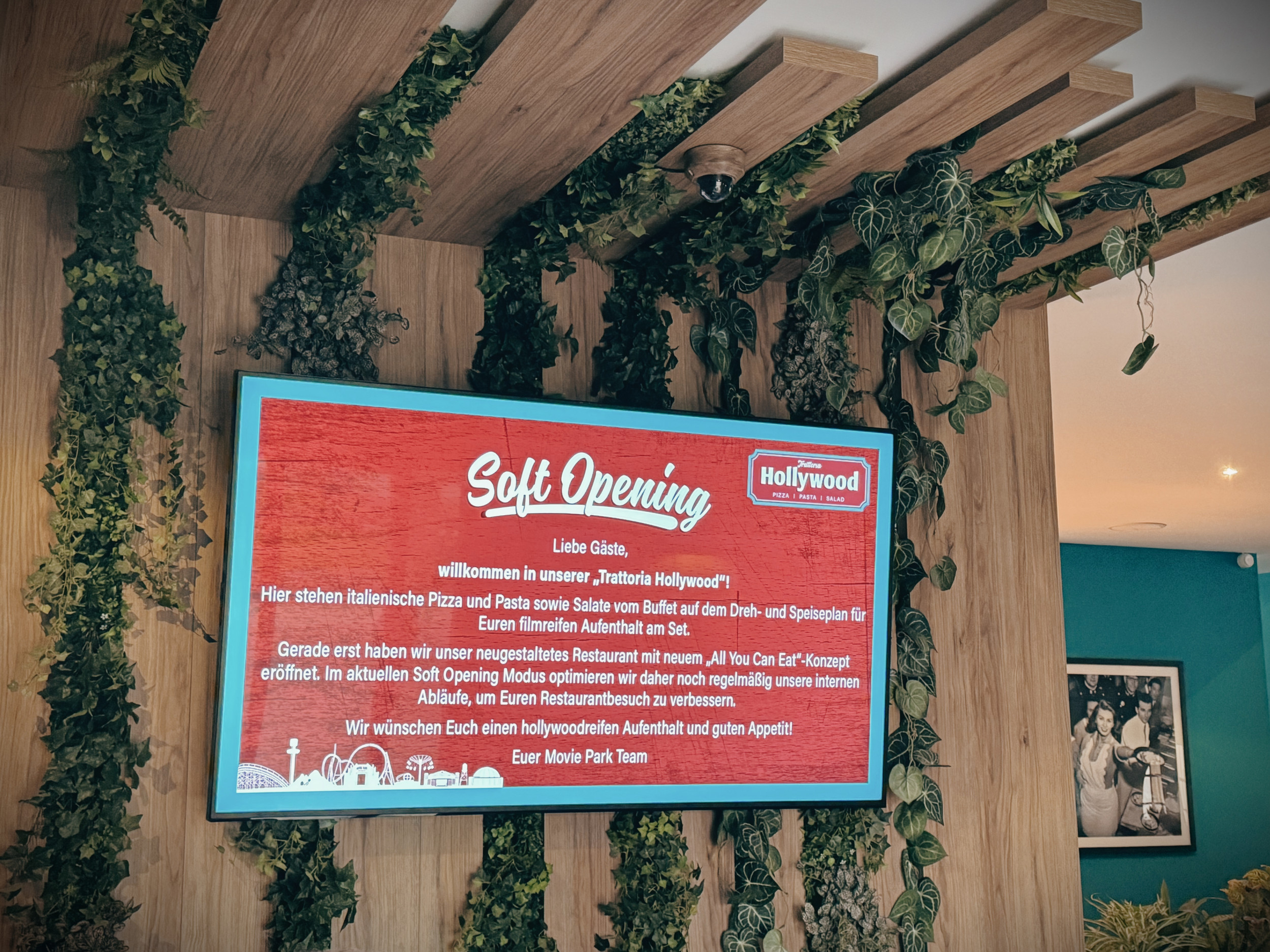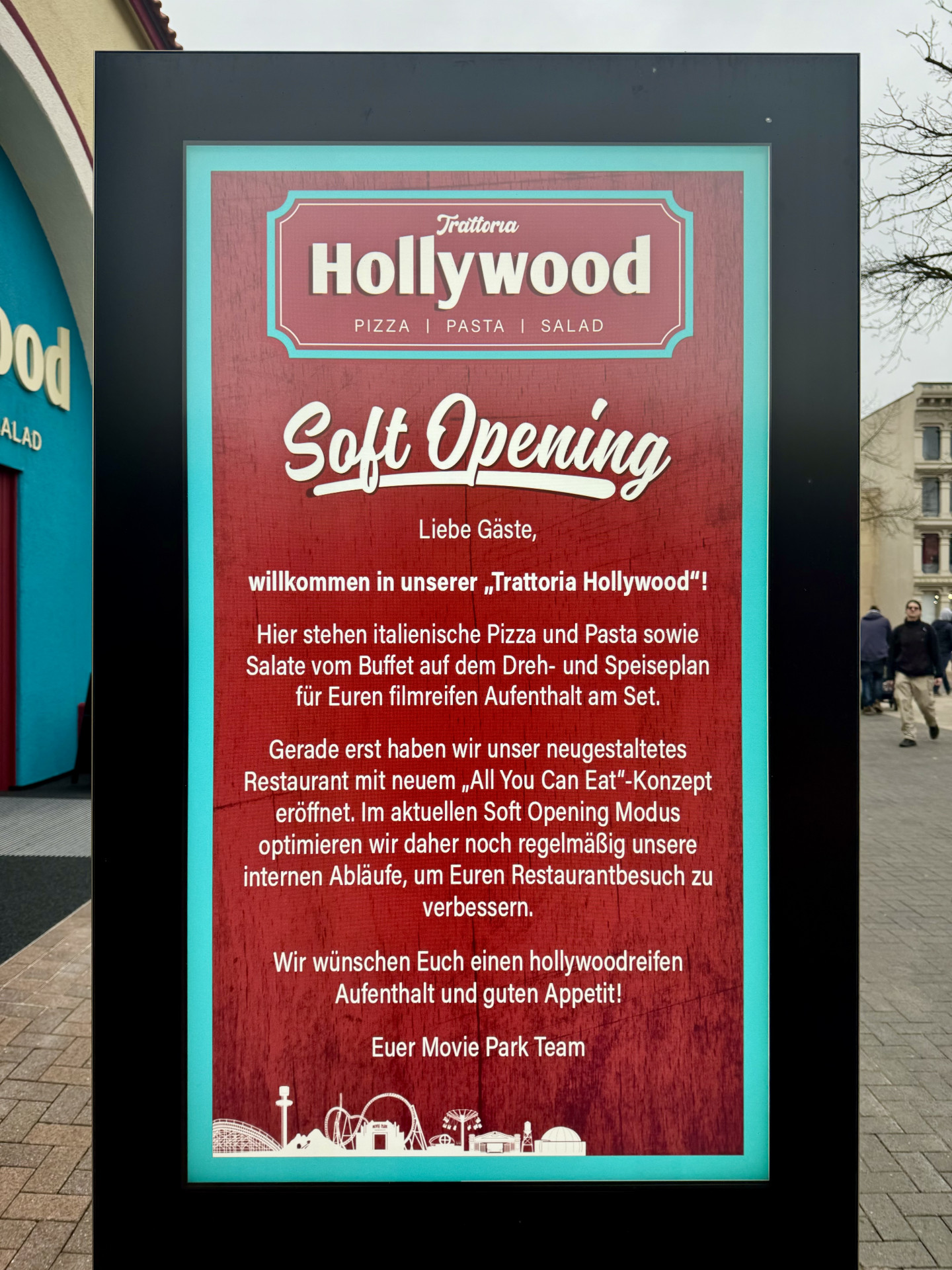 Während der Winterpause standen in Hollywood in Germany einige Umbauarbeiten auf dem Produktionsplan. Im Rahmen seiner Qualitätsstrategie hat Movie Park sein ehemaliges „Pizza & Pasta“-Restaurant großflächig renoviert und sein Konzept verändert. In der neuen „Trattoria Hollywood“ erwartet die Gäste ein neues, gemütliches Ambiente im amerikanisch-italienischen Stil. Gegen eine einmalige Gebühr können sie Pizza, Pasta, Salate und Snacks vom italienischen „All You Can Eat“- Buffet genießen, an der Zapfanlage ihre Getränke wählen und in den neuen Räumlichkeiten mit circa 250 Indoor-Sitzplätzen verweilen oder die Außenterrasse nutzen. Zum Saisonstart soll die neue Trattoria erstmal im „Soft Opening Modus“ eröffnen, um die operativen Abläufe zu optimieren.