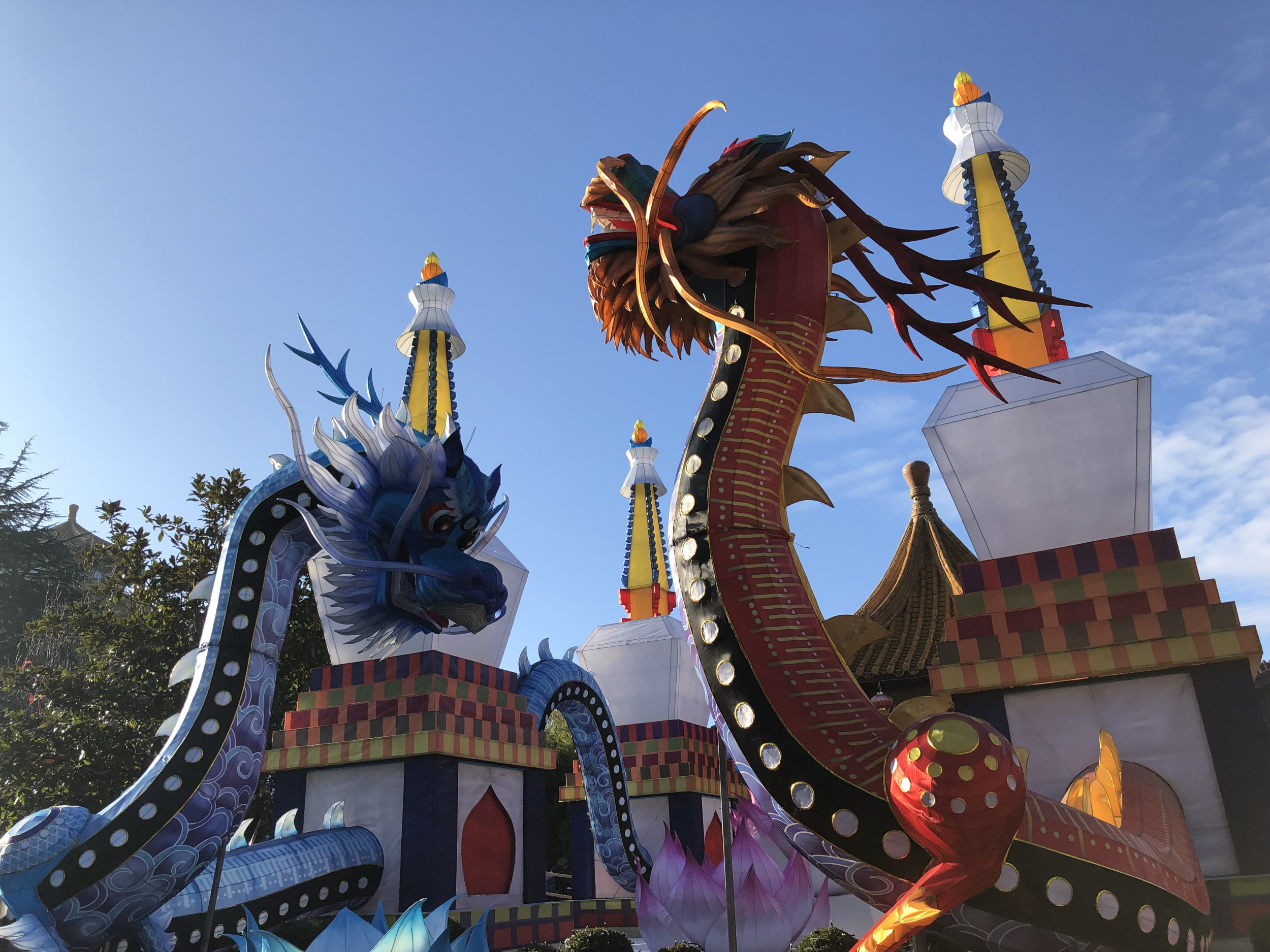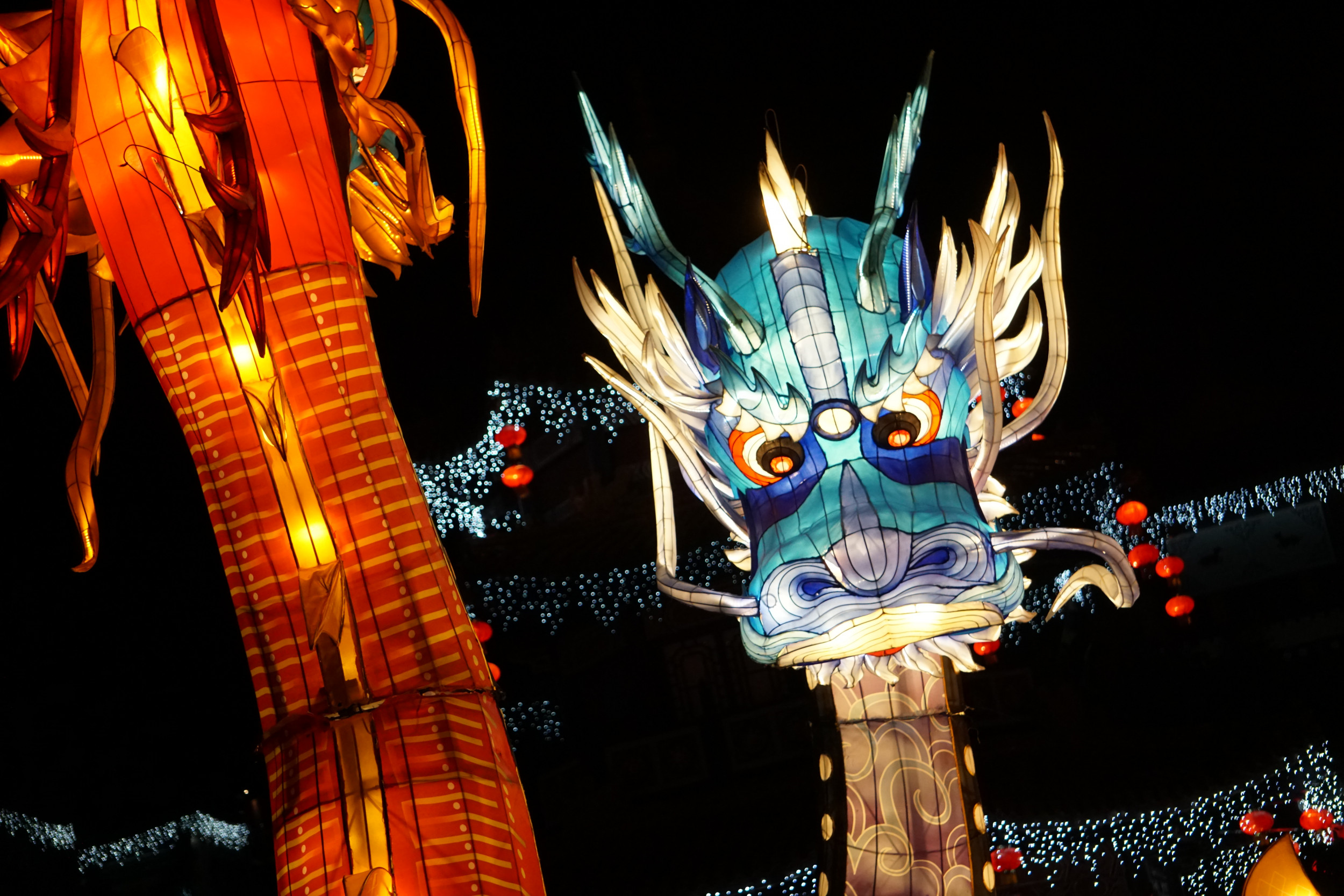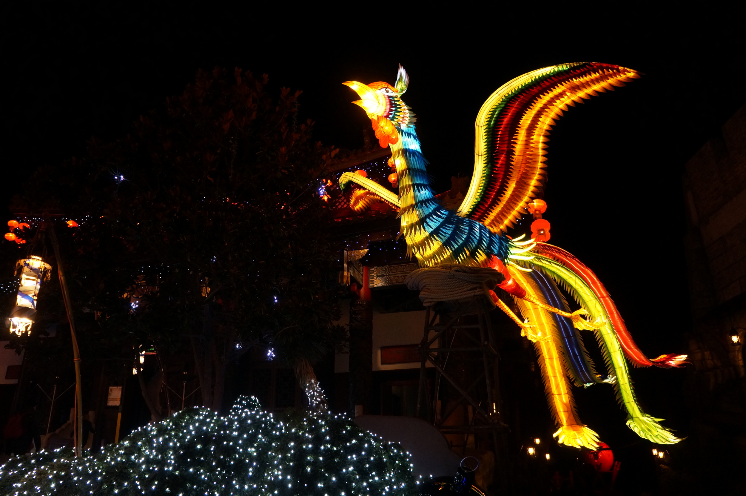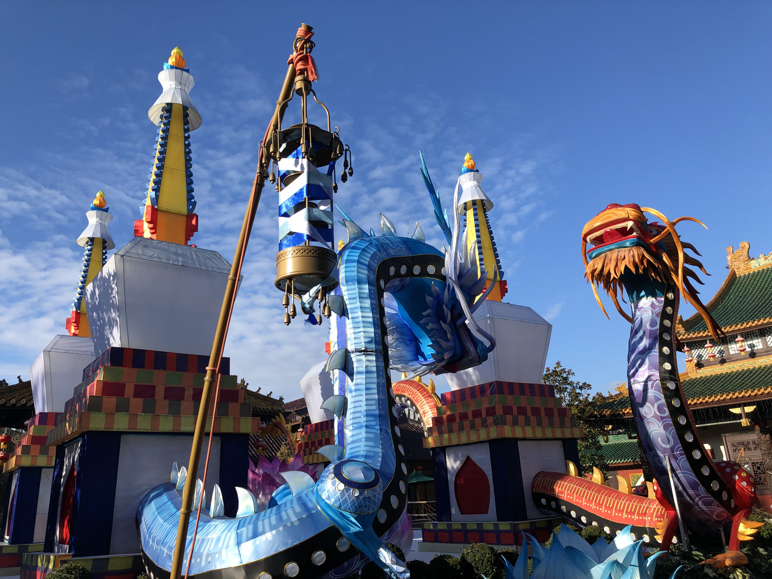 Inmitten der glitzernden Pagodenstadt ragen meterhohe Drachenskulpturen in Richtung Himmel und verwandeln den asiatischen Themenbereich, zusammen mit weiteren leuchtenden Fabel – und Tierwesen, in ein farbenfrohes Spektakel. Unbedingt anschauen solltet Ihr euch auch den aufwändig dekorierten Garten des asiatischen Vier-Sterne-Hotels Ling Bao. Abertausende Lämpchen verwandeln den Innenhof des Hotels in ein strahlendes Lichtermeer.