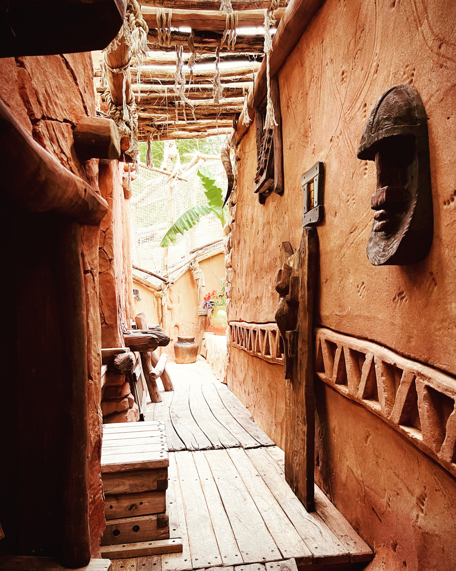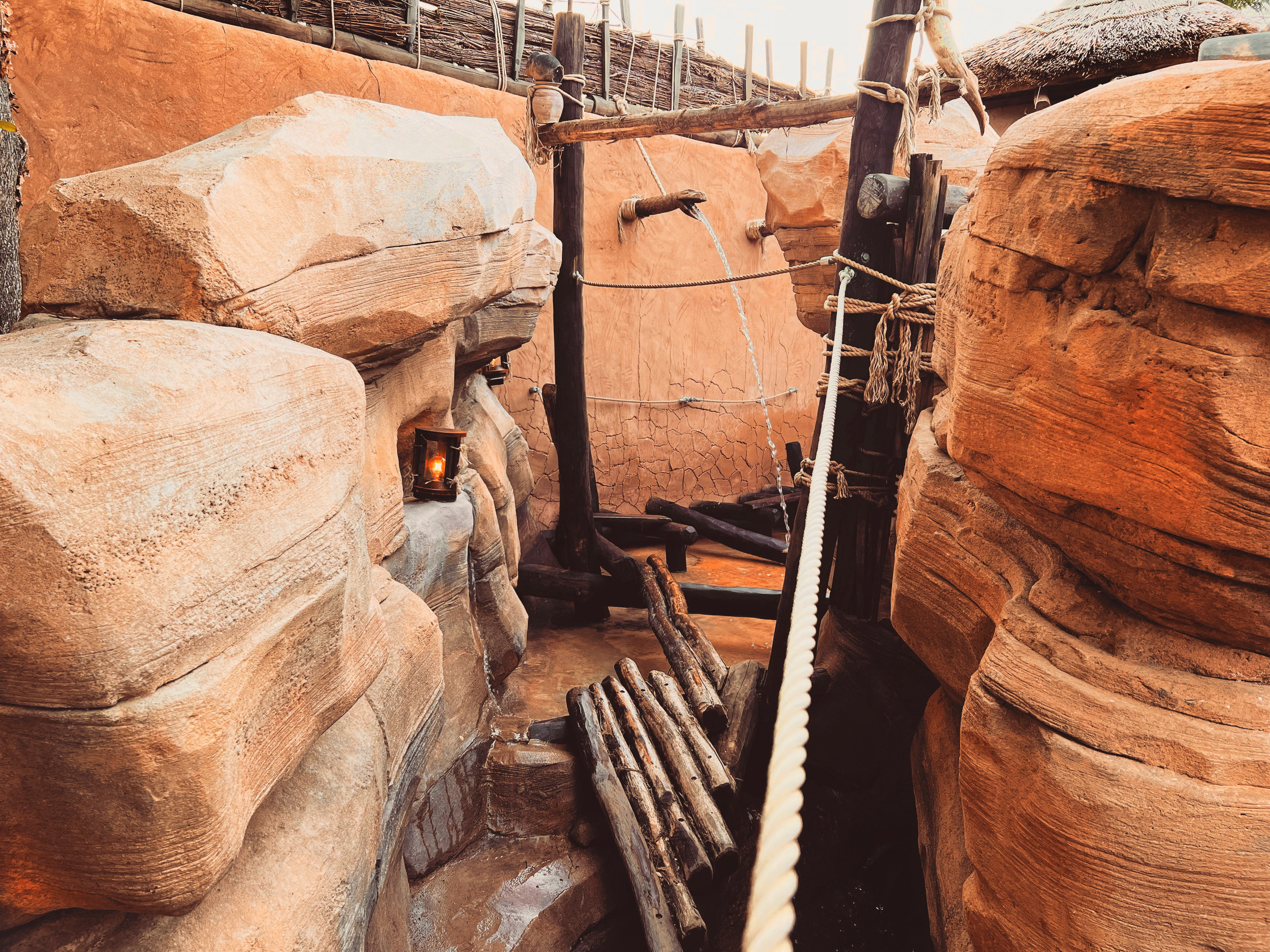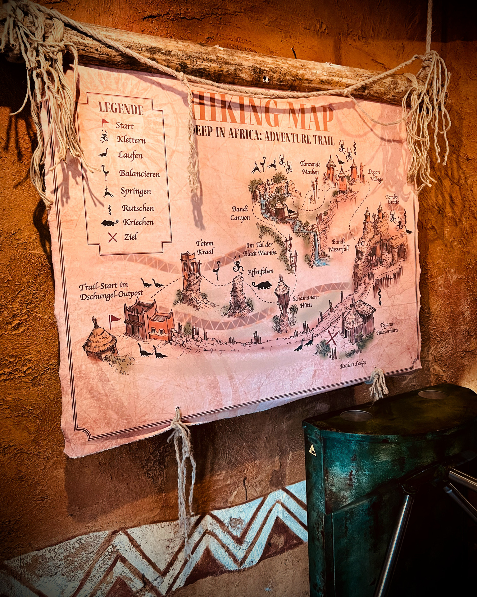 Jede Reise beginnt mit einem ersten Schritt. Unsere abenteuerliche Expedition startete mitten im Herzen des afrikanischen Themenbereichs. Genauer gesagt im Dschungel Outpost, der den direkten Zugang in die faszinierende Wildnis ermöglicht. Nachdem wir in den Räumlichkeiten des Außenpostens zunächst unserer Besatzung zugeteilt und mittels einer großflächigen Hiking Map auf unseren bevorstehenden Rundgang vorbereitet wurden, betraten wir als Gruppe erstmals die magische Dschungelwelt.